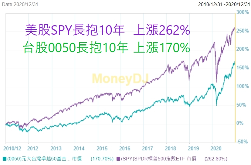 台股最有名的大盤股是元大投信發行的臺灣50,也就是0050。美股最有名的大盤股是SPDR發行的是SPY。暫時不考慮美元和台幣的匯差,如果我們在10年前各投入100萬台幣,而且這10年間不動這筆資金,那麼10年後的現在,投入美股SPY的錢會成長262%,變成362萬。如果當時把這筆錢投入台股,10年後的現在會成長170%,變成270萬。(資料來源:MoneyDJ)